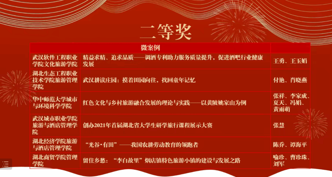 2022年12月11日,由湖北省高等院校本科旅游管理类专业教学指导委员会、湖北省旅游学会和湖北省酒店管理职业教育集团主办,华中科技大学出版社、湖北经济学院承办的首届湖北省高校旅游管理类专业创新案例大赛网络决赛圆满落幕。