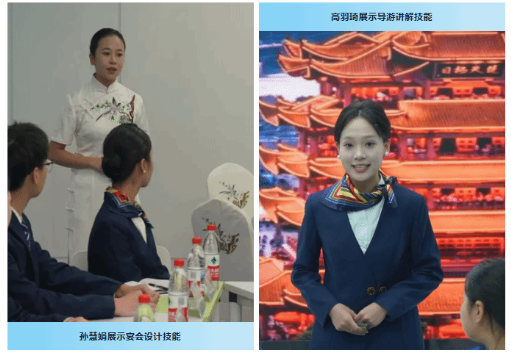 酒店专业学生孙慧娟化身“宴会设计师”,凭借精巧的桌艺布局、创意的餐具搭配,将专业知识与审美素养融入每一处细节,呈现出一场兼具实用性与艺术性的宴会场景设计。旅游专业学生高羽琦则以“金牌导游”的自信,用流畅的语言、饱满的热情讲解黄鹤楼景点,从历史背景到文化内涵,从游览路线到服务贴士,尽显扎实的专业功底与良好的沟通能力。