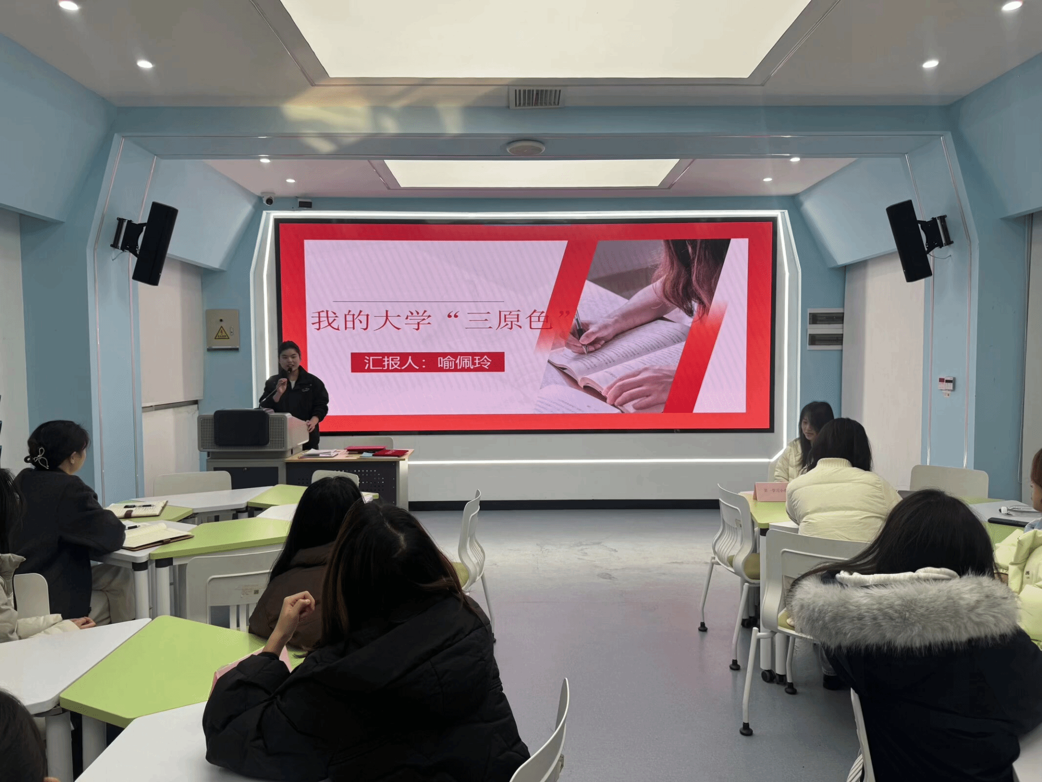 “奋斗是青春最亮丽的底色”,获奖学生代表与大家深入交流:武汉市政府奖学金代表商英2302班阮薇薇、国家励志奖学金代表旅游2401班何东圳分享了学业攻坚、以赛促学和实践成长的经历;优秀学生干部代表商英2401班曾佳怡讲述了服务集体的责任与收获;特色寝室代表旅游2303班喻佩玲则传递了寝室互助共进的温暖力量。他们的发言里,有对学院与老师的感恩,更有向全体同学发出的“以榜样为镜、向优秀看齐”的倡议,细致真挚的分享里,处处涌动着青春奋进的向上力量。