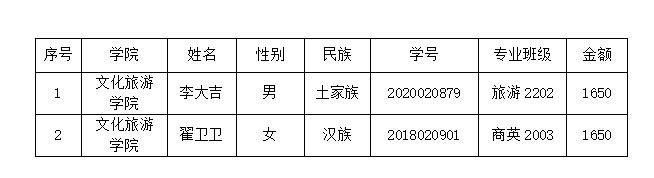 根据湖北省学生资助管理中心的工作要求及学校《关于2023年春季学期退役士兵国家助学金初评工作的通知》要求,在公平、公正、公开原则基础上,经学生个人申请、辅导员审核、学院学生奖励与资助工作小组评审以及学院党政联席会议讨论通过,拟推荐以下学生获得2023年春季学期退役士兵国家助学金,现在文化旅游学院公告栏和官网进行公示,名单如下: