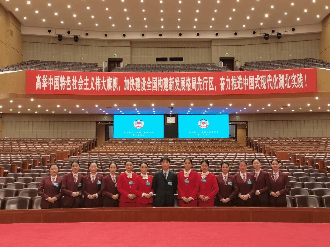 2024年1月29日至2月2日,湖北省第十四届人民代表大会第二次会议及政协第十三届委员会第二次会议在武汉市洪山礼堂胜利召开。文化旅游学院酒店管理与数字化运营专业、旅游管理专业和商务英语专业2022级、2023级13位同学担任礼仪志愿者积极配合礼堂工作,圆满完成大会服务保障任务。