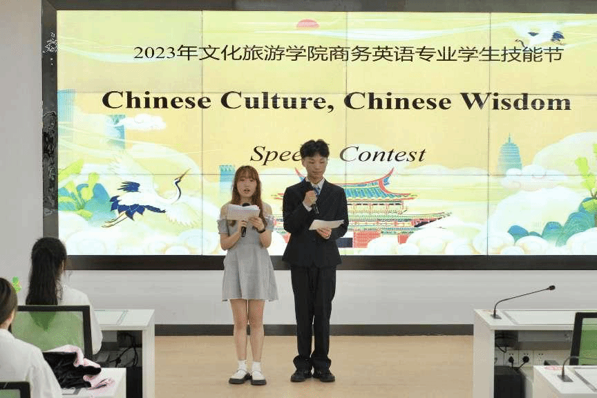 (通讯员:闫素)为响应2023年职教周主题号召,5月18日下午,文化旅游学院商务英语专业学生技能节“Chinese Culture,Chinese Wisdom”主题英语演讲大赛决赛在我院拉开帷幕,20位来自2021级和2022级的选手同台竞技。大赛结合英语专业特色,参照大学生竞赛排行榜项目“中国教育电视台·外研社杯”职场英语挑战赛英语演讲大赛的标准,要求选手进行三分钟英文定题演讲。在一阵阵热烈的掌声中,演讲者展现了卓越的专业素养,聆听者感受到了浓厚的家国情怀。