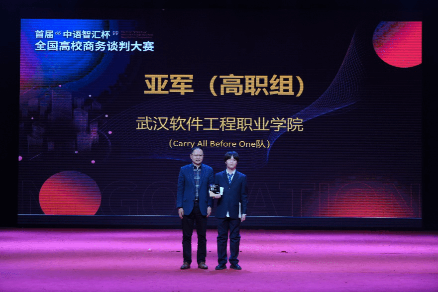 本次大赛由中外语言比较文化学会和四川外国语大学共同主办。大赛从初赛、复赛到全国总决赛历时一年,竞赛语种为英文,全面考查学生的国际商务谈判知识、谈判技巧、英语口语、思辨能力、跨文化交际能力及团队协作能力。比赛分为三轮,前两轮通过面对抽签产生的对手,双方本着合作共赢的原则,唇枪舌剑、谋求发展、达成共识,最终程雯杰、周靖杰、刘云航、阮豪等四名同学组成的Carry All Before One队进入高职组前两名,登上了第三轮巅峰对决的舞台,最终获得亚军;由张云、王梦婷、何一可、刘艺组成的Harmony Win Win队获得季军。
