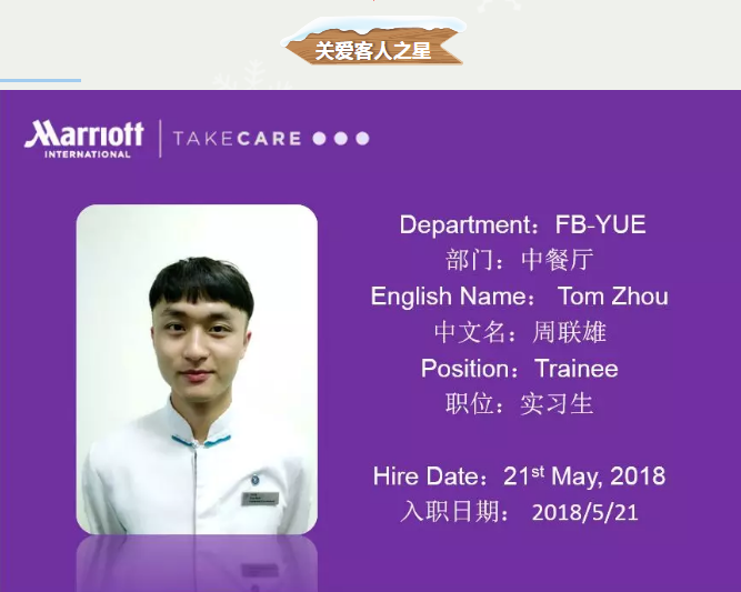 2018年5月份进入喜来登酒店餐饮部以来,周联雄保质保量地完成工作,熟练掌握各项工作技能,服务意识极强。今年六月份安排他服务V5包房,那天客人喝了酒,他便主动帮客人泡蜂蜜柠檬水,换热的毛巾,对于一名初入职场的学生来说能非常的难能可贵,他的一举一动都温暖着客人的心。今年11月3日晚上有位客人落下了一个文件袋,他在检查包房时及时发现并主动联系客人,这份资料是客人公司的重要文件,事后客人对他表示了由衷的感谢!周联雄用心、周到,更积极,更主动,能够给客人提供优质服务,不论工作还是生活中总是那么开朗,带给周围同事满满的正能量!
