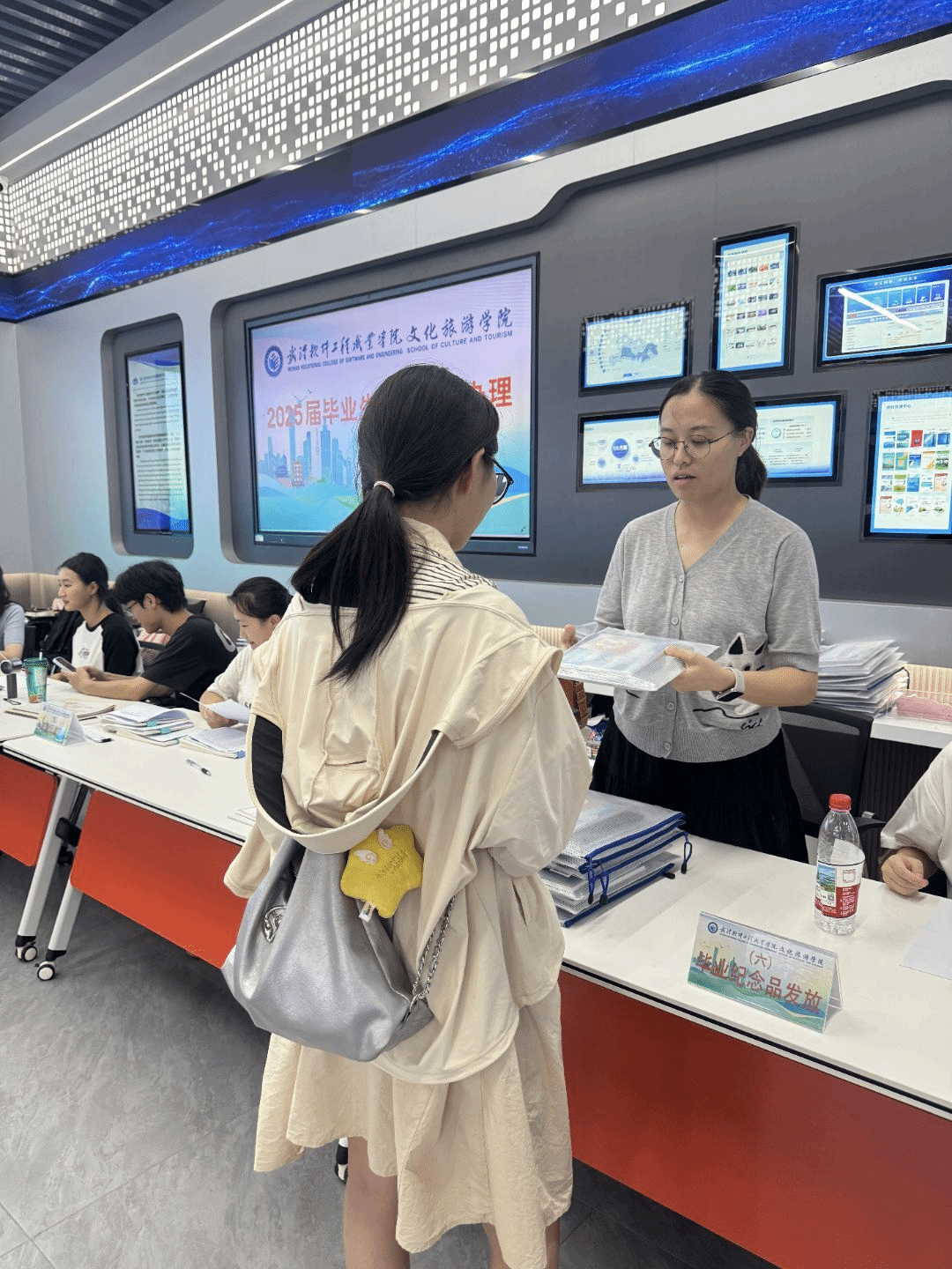 走进双创大楼一楼,辅导员们精心布置的现场格外温馨。2025届毕业生们正有序办理手续,他们的脸上,既有对未来的憧憬,又难掩对母校的眷恋。老师们耐心细致地为毕业生办理档案材料审核、团组织关系转接、毕业证书发放、毕业纪念品发放等各项手续。“青春如歌 毕业如诗 踏歌而行 前途似锦”是对同学们满满的祝福,老师们的饱含深情的叮嘱,为同学们送去了更多的温暖和力量。